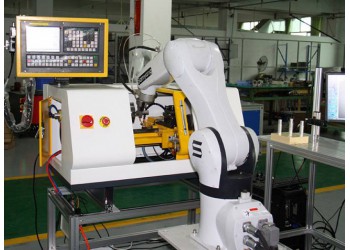 工業(yè)機器人上下料數(shù)控車床實訓系統(tǒng)含一臺六工業(yè)級自由度機器人、一臺小型數(shù)控車床、PLC模塊、一個毛坯件暫存區(qū)、一個加工合格品暫存區(qū);綜合性強:集機器人編程、傳感器、PLC、單片機、通訊于一體,將執(zhí)行機構、控制系統(tǒng)、驅(qū)動系統(tǒng)及各專業(yè)學科有機結合;機器人負責數(shù)控機床的上下料工作;當其中一臺機床零件加工完畢后,自動取出,并重新送料安裝新的毛坯件,等待下一個指令;車床用于加工零件的工序,加工完畢后由機器人送到下一道作序,機器人可根據(jù)指令主動完成機床的上料、下料等工序;可擴展增加機器視覺檢測功能,由機器人抓取已加工完畢的零件到視覺檢驗區(qū),對加工完整性進行視覺檢測,如果符合加工要求的零件,機器人則取出保存到合格品暫存區(qū),否則,將保存到不合格品暫存區(qū)。學生在熟練掌握該系統(tǒng)的操作與編程以后,可以對系統(tǒng)加工的產(chǎn)品進行調(diào)整或?qū)庸ず蟮暮细癞a(chǎn)品,通過編程由機器人完成自動裝配。