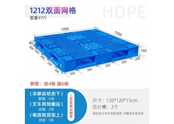 1. 托盤設計:帶防滑墊,面部可裝12個圓形防滑墊,貨叉與雙面貫穿,托底12個防滑墊;