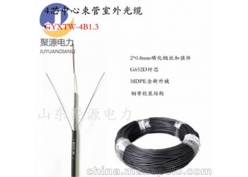 GYXTW 光纜的結構是將 250μm 光纖套入高模量材料制成的松套管中,松套管內填充防水化合物。松套管外用一層雙面涂塑鋼帶(PSP)縱包,鋼帶和松套管之間加阻水材料以保證光纜的緊湊和縱向阻水,兩側放置兩根平行鋼絲后擠制聚乙烯護套成纜。